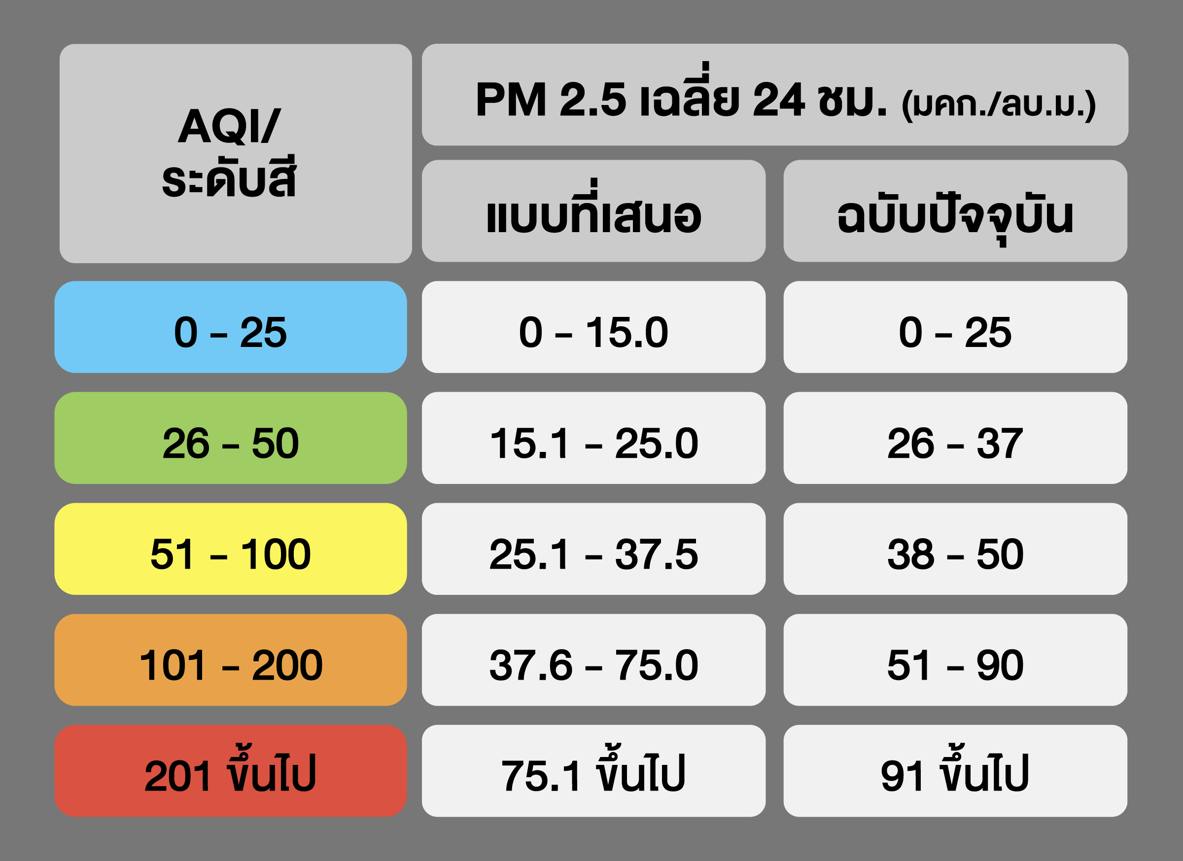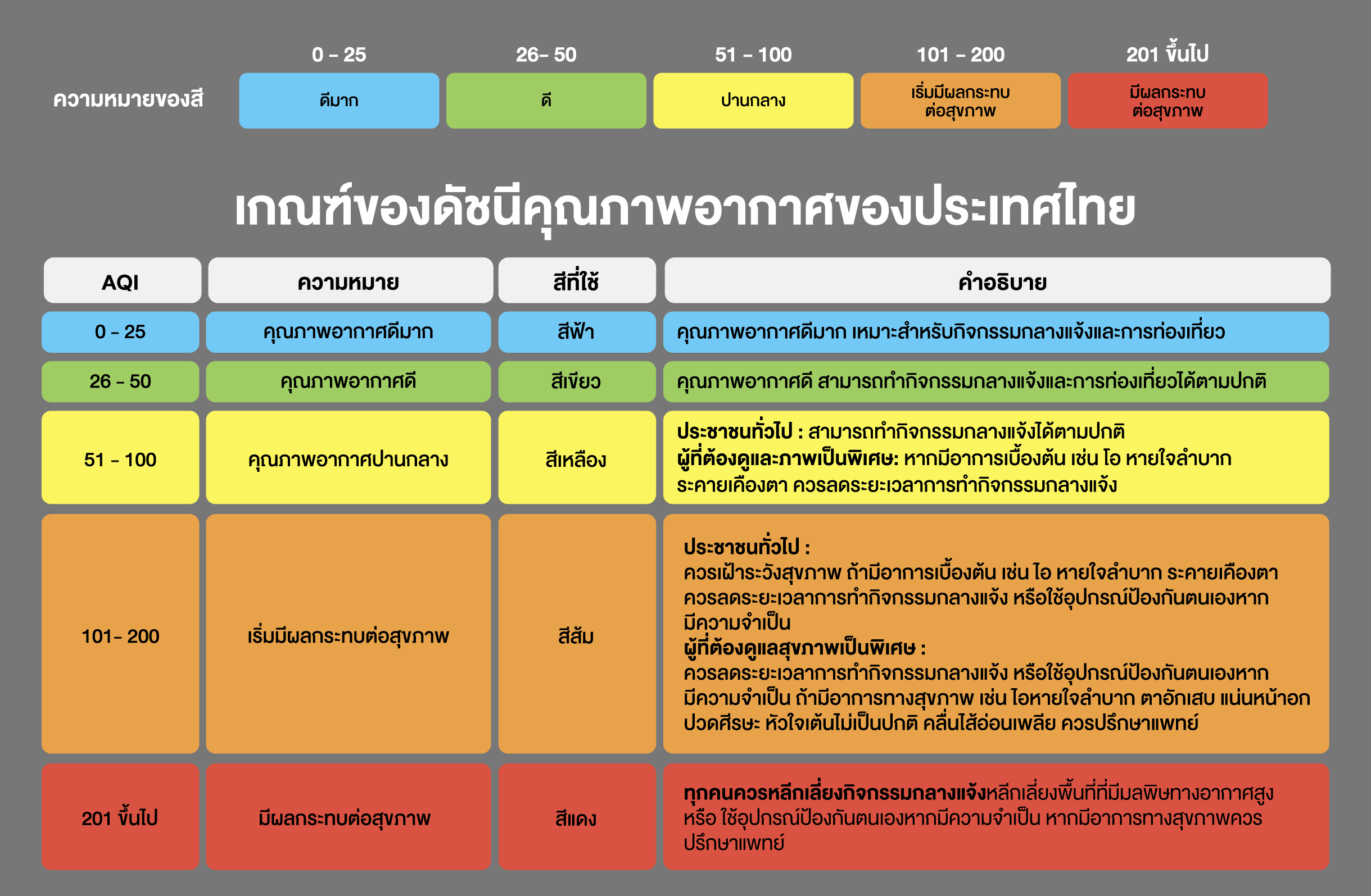 สำหรับประเทศไทย ปัจจุบันดัชนีคุณภาพอากาศ (AQI) ของเราแบ่งออกเป็น 5 ระดับ คือ ตั้งแต่ 0 ถึง 201 ขึ้นไป (ตารางที่ 1) ซึ่งแต่ละระดับจะใช้สีเป็นสัญลักษณ์เปรียบเทียบระดับของผลกระทบต่อสุขภาพอนามัย ส่วนค่าความเข้มข้นของฝุ่น PM2.5 ก็จะสัมพันธ์กับค่า AQI นี้ โดยมีการปรับปรุงใหม่ให้เกณฑ์สีแดง (มีผลกระทบต่อสุขภาพมาก) เริ่มจาก 75.1 ไมโครกรัมต่อลูกบาศก์เมตรขึ้นไป (ตารางที่ 2)